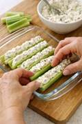 Stuff the celery boats: Using a small spoon or a butter knife, scoop the creamy mixture and press it gently into the hollow of each celery stick, smoothing the top as you go. Work over the glass dish so any little spills land right where you need them. Continue until all the celery sticks are generously stuffed and lined up in the dish.
